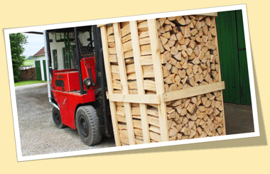 Auslieferung der gewünschten Menge an Holz in Boxen per LKW mit Ladekran.